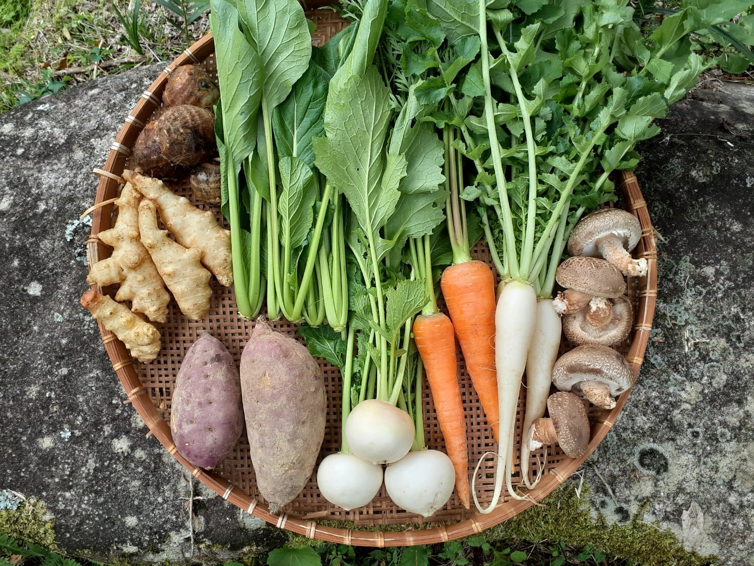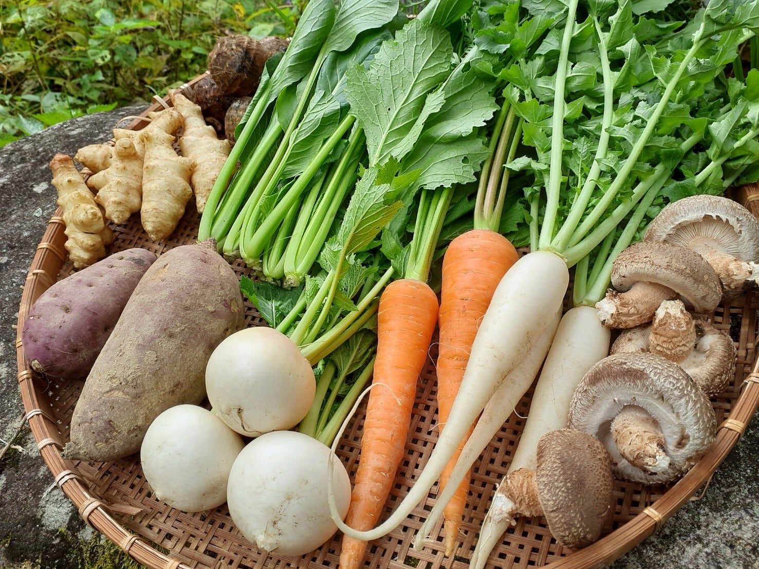 菊芋、里芋、原木椎茸、大根、ニンジン、カブ、小松菜、チンゲン菜など、その時に採れた冬の野菜をセットにしてお届けします。